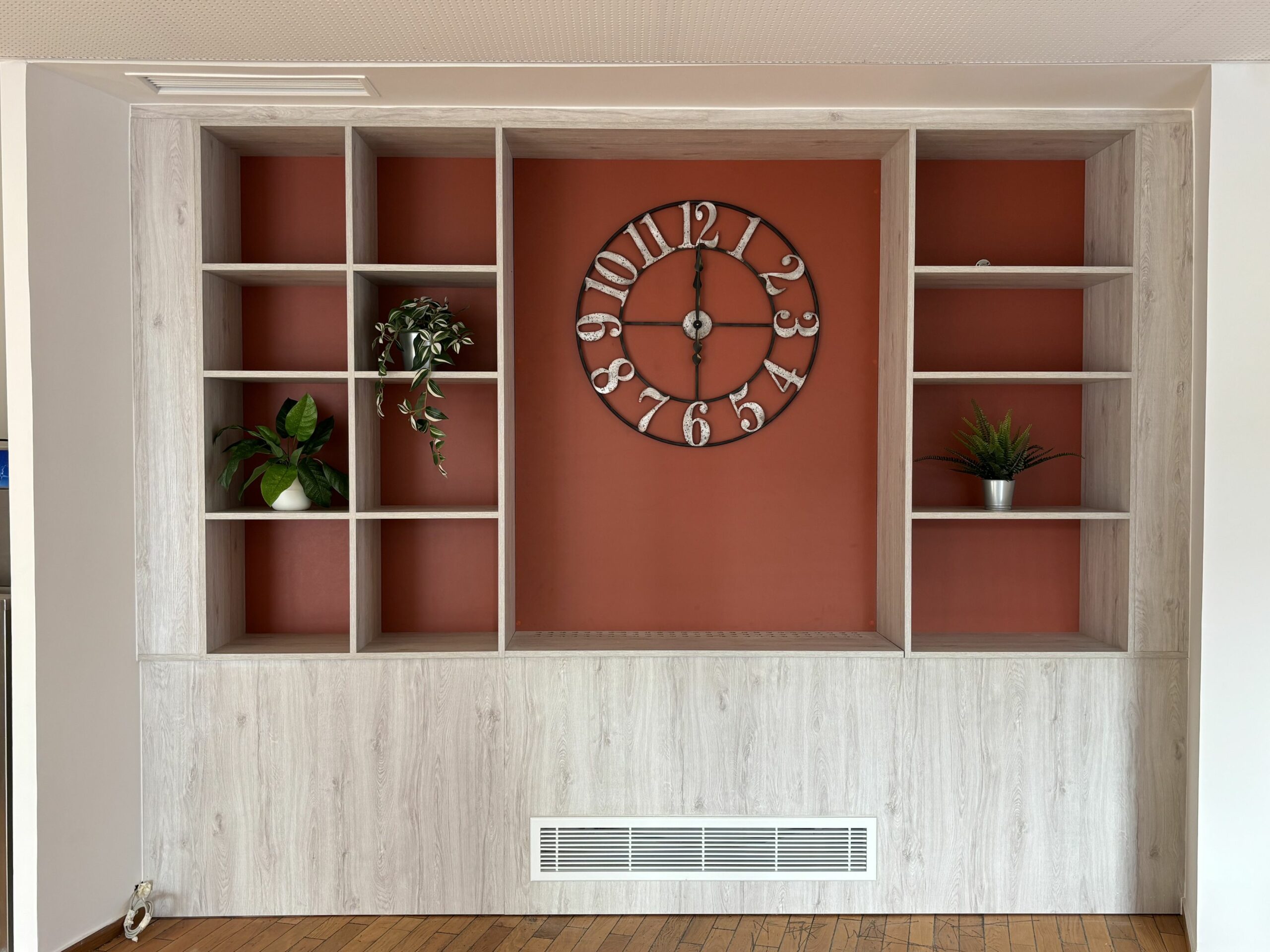 - Une étagère conçue sur-mesure exploitant élégamment un espace inutilisé