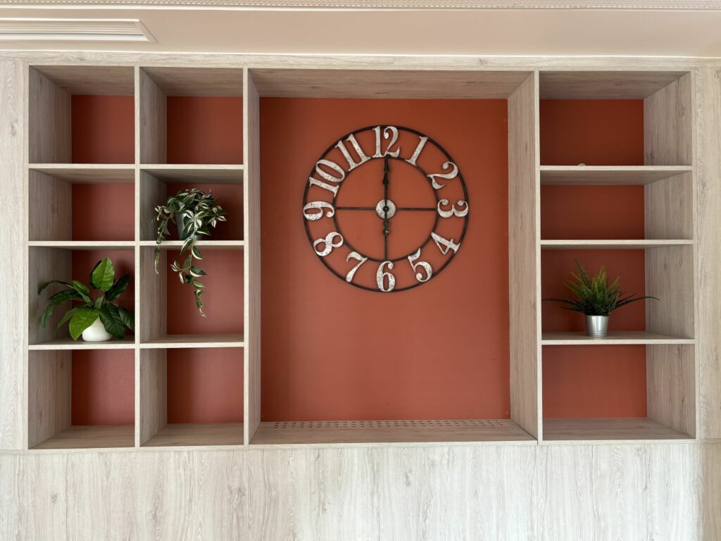 Le rouge brique, appliqué en fond de bibliothèque et de kitchenette, insuffle chaleur et dynamisme à l’ensemble. En contraste avec le bois clair, les résidents peuvent apprécier l’ambiance à la fois stimulante et apaisante. Associée aux plantes, cette palette évoque les éléments naturels et renforce la sensation d’un lieu de vie où l’on se sent bien, comme chez soi.