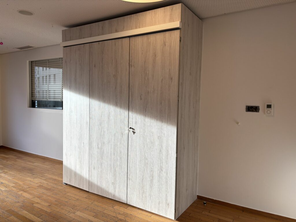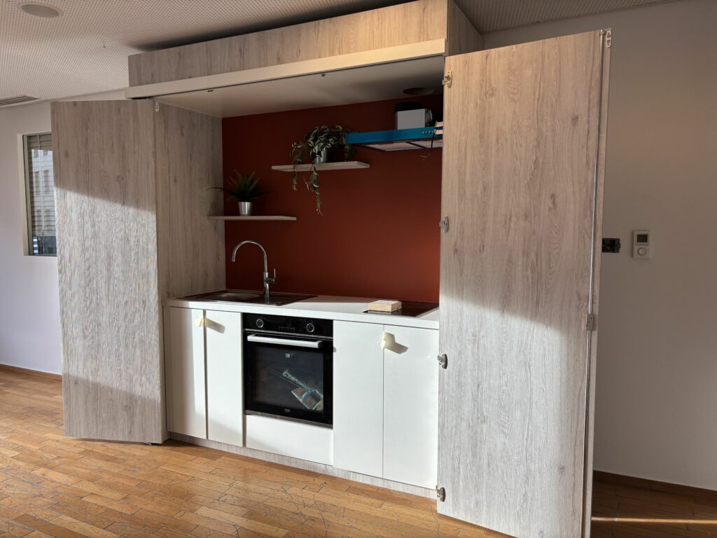 - Une kitchenette conçue sur-mesure qui, une fois fermée, se transforme en placard discret